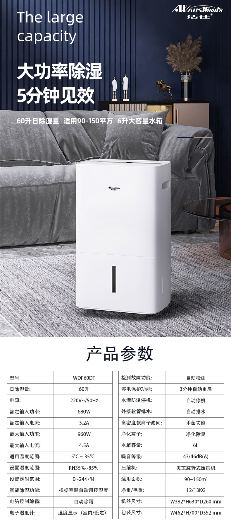 日除湿量60升(30℃ RH80%),6升大水箱,除湿能力强,节能、环保、低噪音,标配温度感应式智能控湿、自定义湿度调节、滤网清洗提示、24小时定时开关机、WiFi 远程控制、干衣功能、童锁功能、净化除臭、故障自检、重启保护等多种功能。适合别墅/医院/实验室/地下室/库房等各类场所。